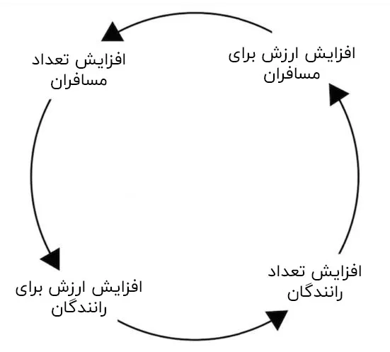 یک سرویس حملونقل آنلاین مانند اسنپ را در نظر بگیرید. افزایش تعداد مسافران در این سرویس نهتنها ارزش کل شبکه را افزایش میدهد، بلکه برای رانندگان نیز مفید است. تأثیری را که افزایش کاربران اسنپ برای رانندگان دارد، میتوان نمونهای از اثر شبکهای غیرمستقیم دانست. البته در بسیاری از موارد، این اثر دوطرفه است. بهعنوان مثال، افزایش تعداد رانندهها نیز همین اثر مثبت را برای مسافران دارد و راحتی بیشتری را برای آنها ایجاد میکند.
