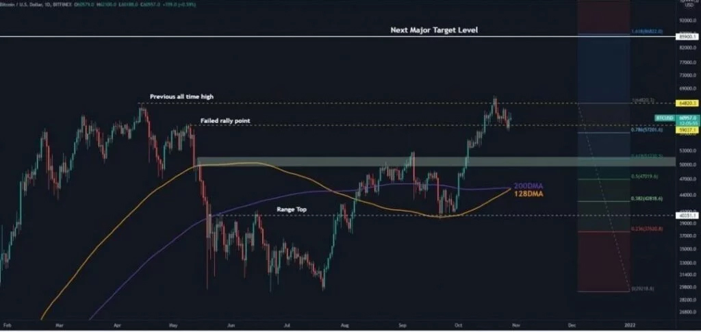 تحلیلگران مختلف معتقدند بیت کوین بالاتر از سطح ۶۰،۰۰۰ دلار در تلاش برای یافتن سطح حمایتی خود بوده و اتریوم نیز به دنبال ورود به فاز کشف قیمت است.