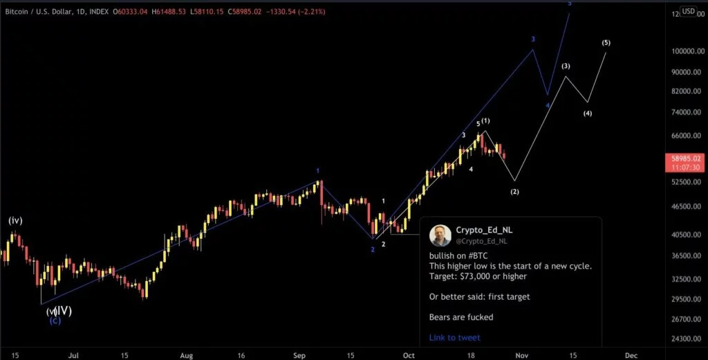 تحولات صعودی قیمت بیت کوین و اتریوم باعث شده است تا بسیاری نسبت به آینده این دو رمز ارز امیدوار باشند. تحلیلگری با نام Crypto_Ed_NL در پیامی توییتری هدف ۷۳۰۰۰ دلاری که پیشتر زمانی که قیمت بیت کوین ۴۰،۰۰۰ دلار بود تعیین کرده بود را اشتباه خواند و آن را افزایش داد.