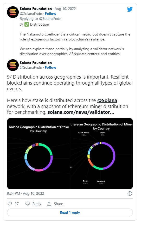 در این گزارش همچنین بیان شده است که ضریب ناکاموتو شبکه سولانا یا همان تعداد اعتبارسنجهای مورد نیاز برای سانسور شبکه معادل با ۳۱ بوده و این تعداد در حال افزایش است. نموداری در این گزارش منتشر شده است که نشان میدهد شبکه سولانا نسبت به سایر شبکهها نظیر آوالانچ، بایننس و پالیگان از ضریب ناکاموتو بالاتری برخوردار است.