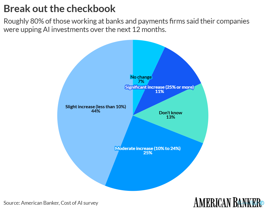 گزارش امریکن بنکر نشان میدهد که با وجود افزایش استفاده، هزینههای بکارگیری هوش مصنوعی نیز افزایش یافته و صنعت مالی و بهخصوص بانکداری بزرگترین هزینهکردها را در جهت استفاده از هوش مصنوعی دارند.