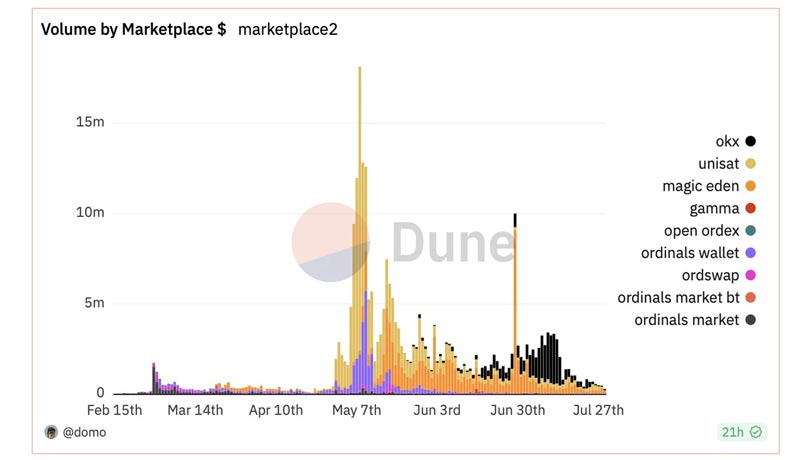 با این حال، دادههای اخیر نشان میدهد که فروش NFT مبتنی بر بیتکوین از اواسط جولای با رکود مواجه شده است. در هفته ۲۲ جولای تا ۲۹ جولای ۲۰۲۳، فروش NFT مبتنی بر بیتکوین ۳۵.۲۲ درصد کاهش یافت و در مجموع به ۴.۵۴ میلیون دلار رسید و در رتبه هفتم فروش NFT و در پشت سر پالیگان(Polygon) قرار گرفت. سولانا (SOL) با ۶.۶۱ میلیون دلار فروش NFT در همان دوره، جایگاه دوم را به خود اختصاص داد.دادهها منتشر شده از سوی Dune Analytics نشان میدهند که از اوایل جولای تاکنون، حجم معاملات مرتبط با اوردینال در بازارهایی از قبیل Okx، Unisat، Magic Eden، Gamma، Open Ordex، Ordinals Wallet، Ordswap، و Ordinals Market کاهش یافته است.